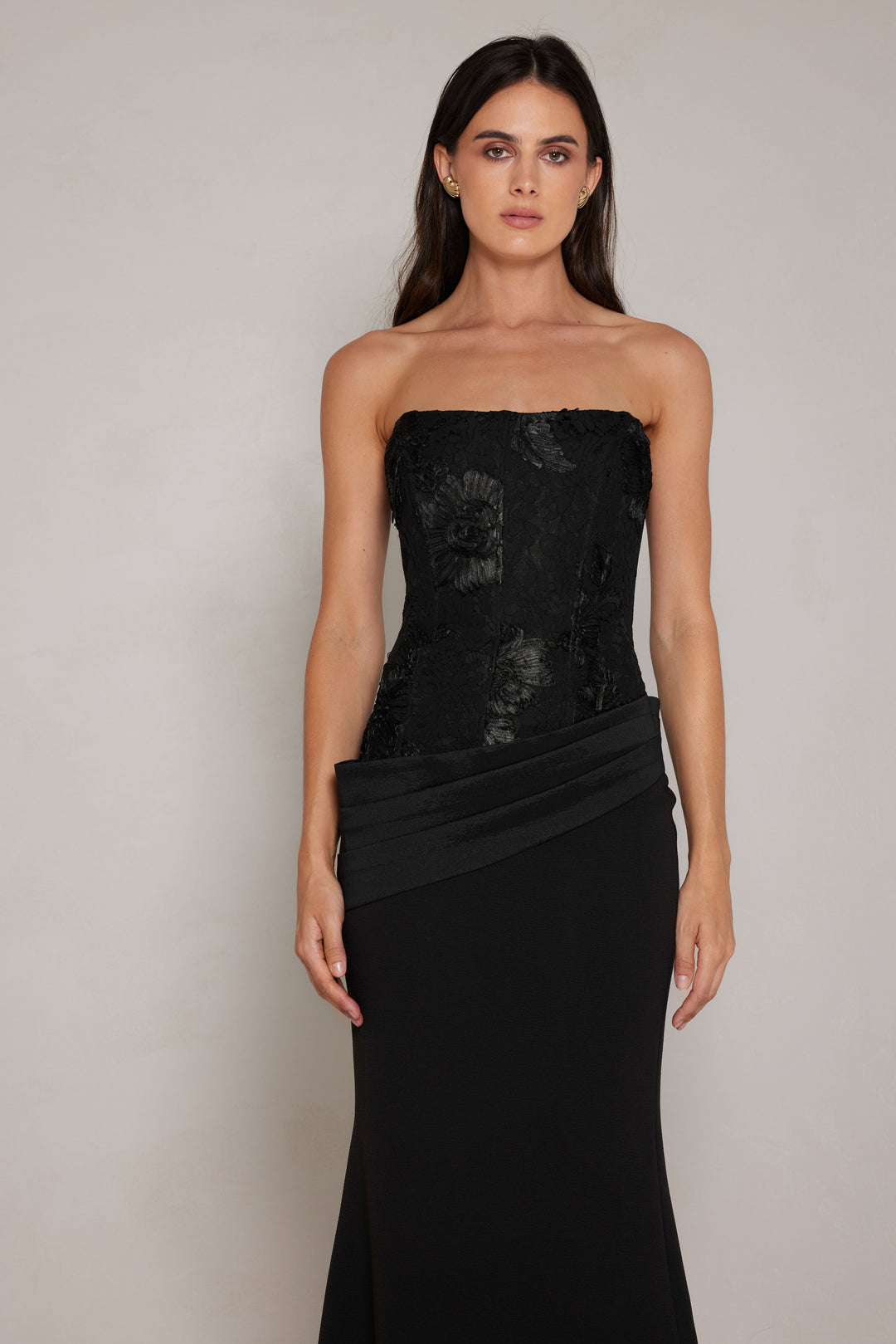 Introducing the Lee Black Strapless Gown: a sleek and elegant dress featuring intricate floral lace detailing on the strapless bodice. The form-fitting silhouette and asymmetrical waist drape create a flattering and sophisticated look.