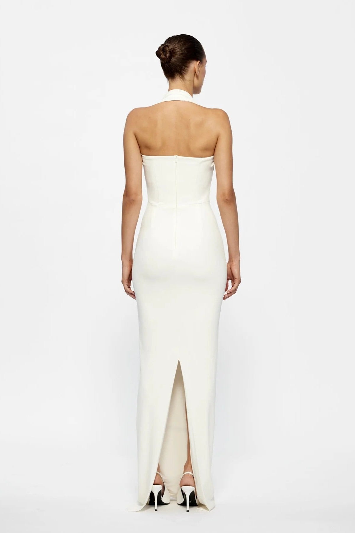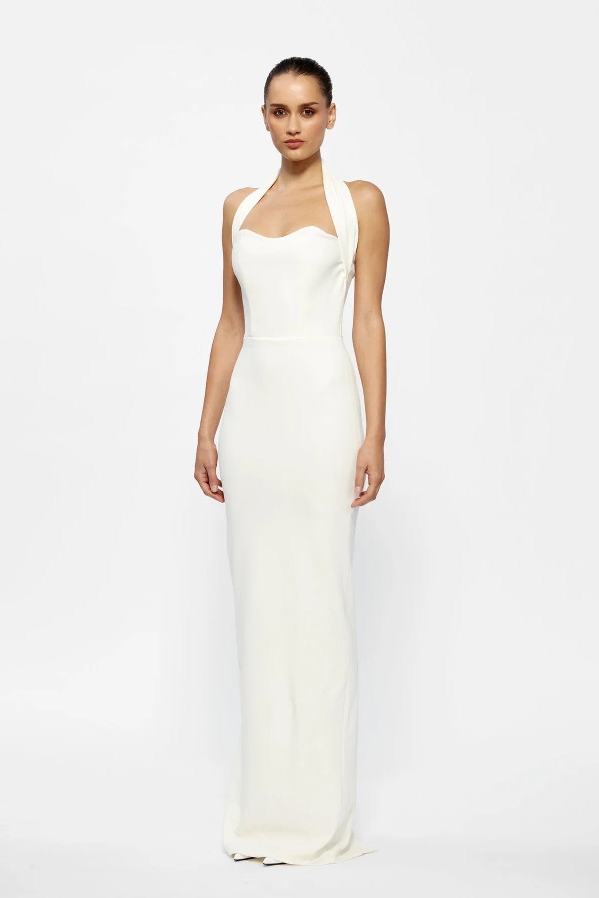 Introducing the Marian Dress, a timeless silhouette made for modern elegance. Designed with our stretch crepe that skims the body beautifully whilst creating a perfect cinch at the waist. The Marian features a classic halter bodice with a sweetheart neckline, beautifully framing the décolletage. Cut for a midi length to take you through all seasons and occasions.