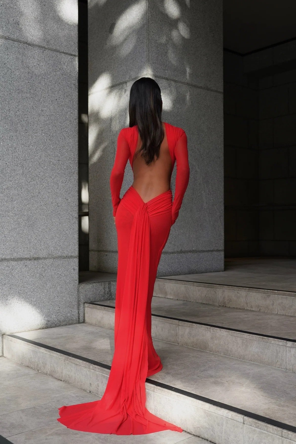 Welcoming the Monaco Gown, where vintage elegance meets modern allure. Crafted from our luxurious soft mesh, Monaco features a high neckline and full sleeves with a daring open back for a touch of sensuality. Detailed with intricate ruching through the bodice and a crossed detail across the waist to cinch in the silhouette. Made to sculpt and highlight the feminine form, the Monaco Gown will ensure timeless dressing with effortless charm.