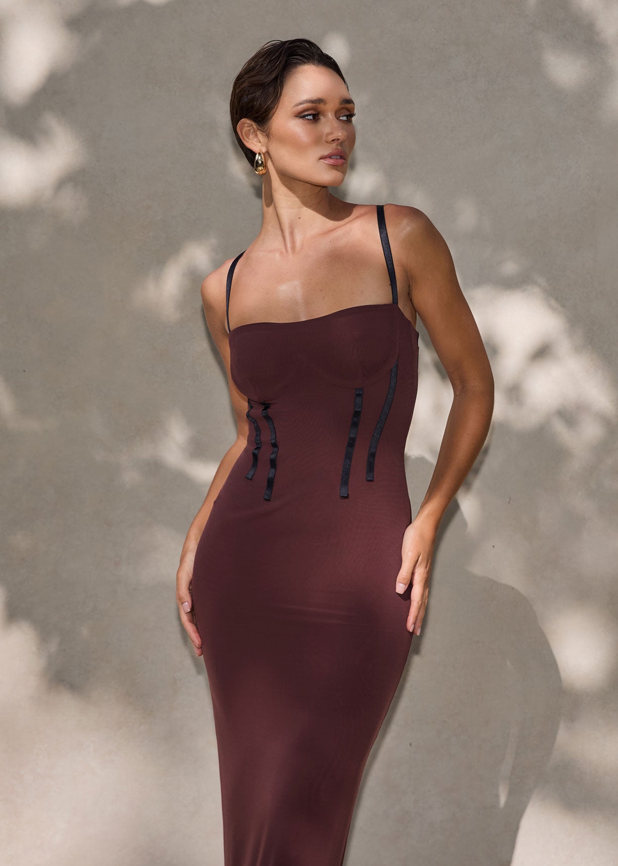 The Nookie Allegra Maxi Dress is an incredible sculpted maxi. It is crafted from a double layer of firm mesh, with underwire and contrast trim. It has an invisible zip and split at the back hem. The dress is fully lined.