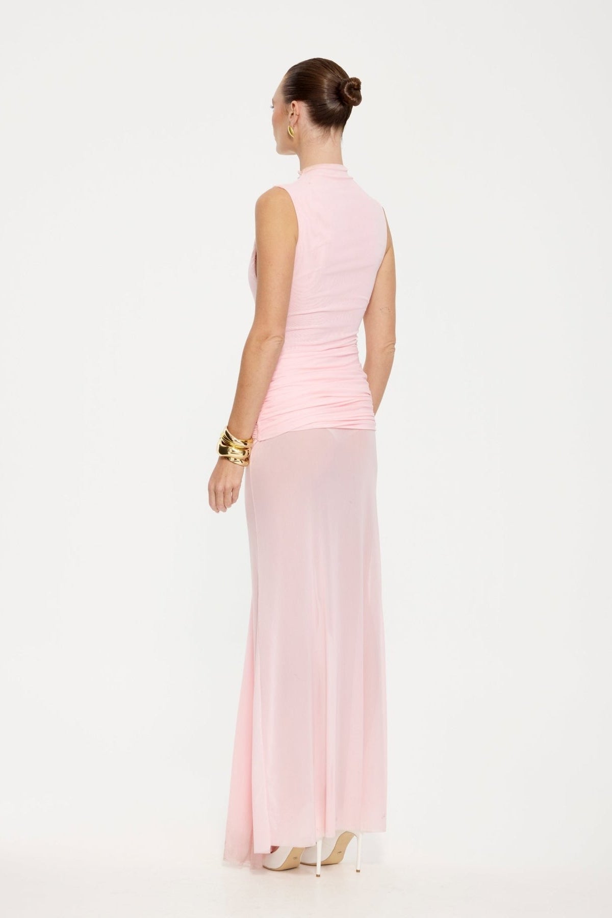 Our favourite mesh maxi in a new colour for the summer season ahead. High neckline design with a fitted silhouette, featuring a twisted drape gathering down the body. Bodysuit lined under dress for added coverage.