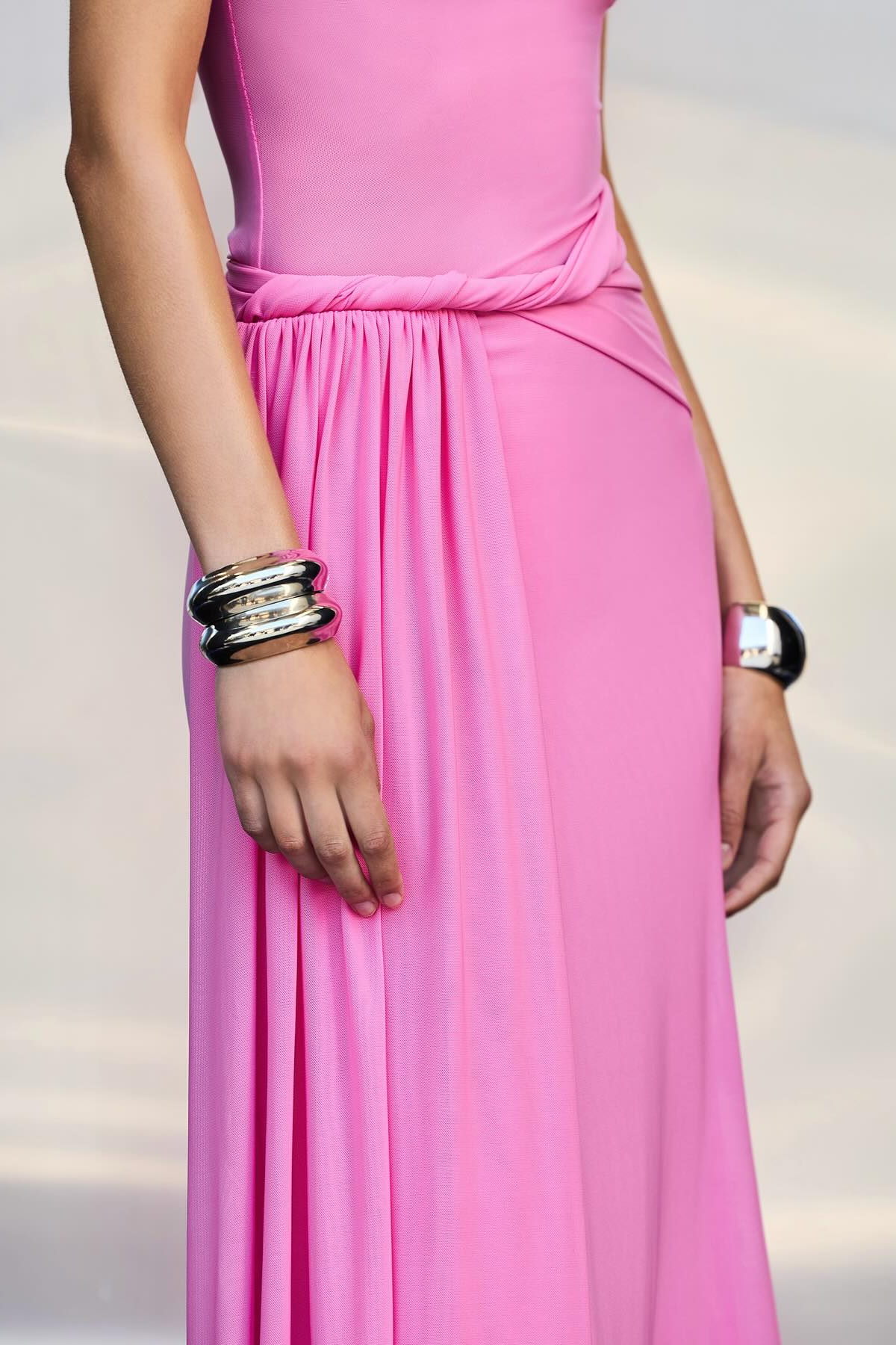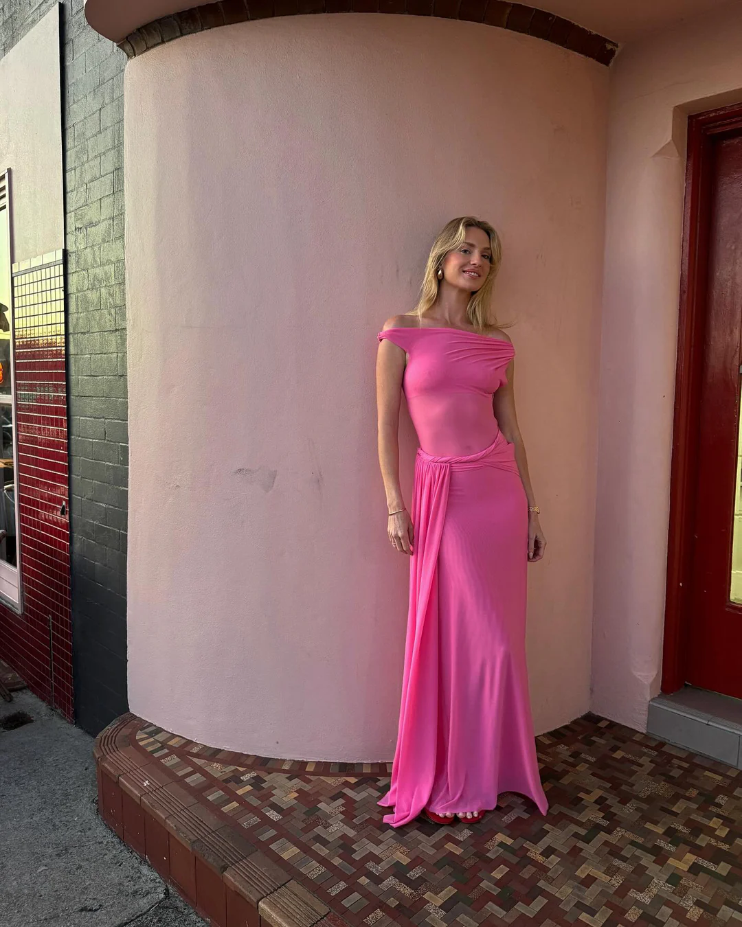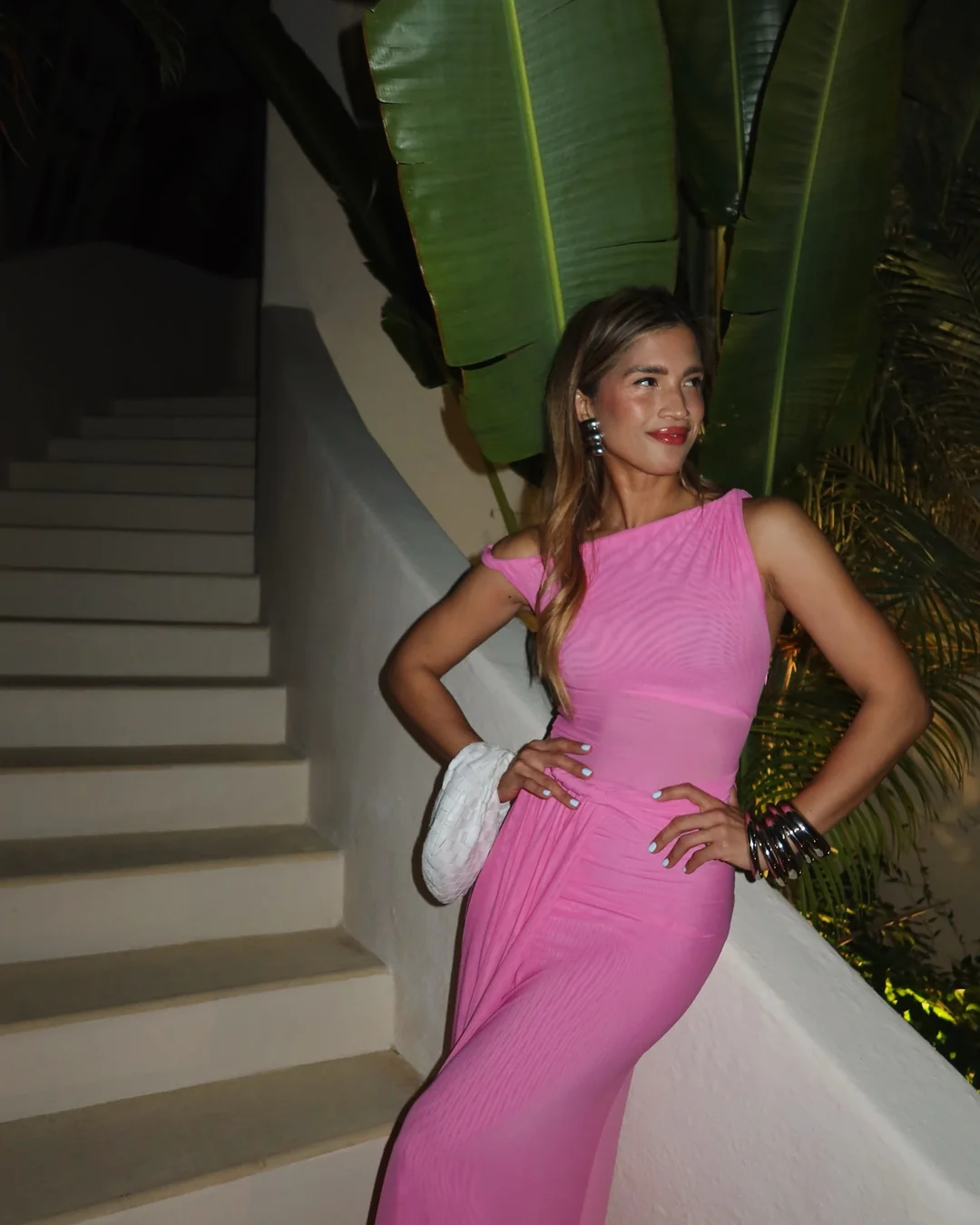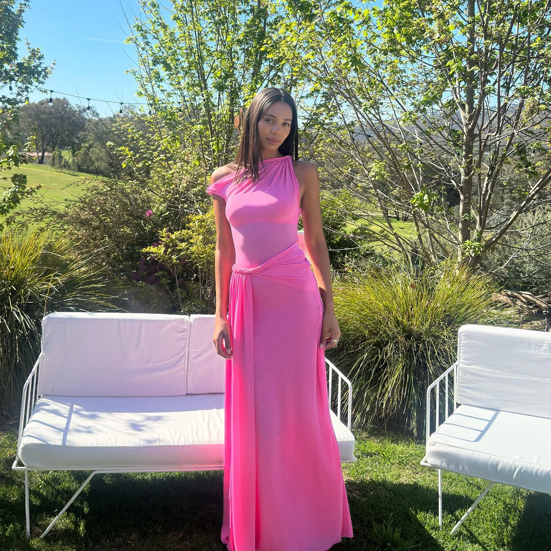 The Misha 'Sisal' Mesh Maxi Dress in Orchid Pink, an effortless, yet sexy draped silhouette that skims the body.