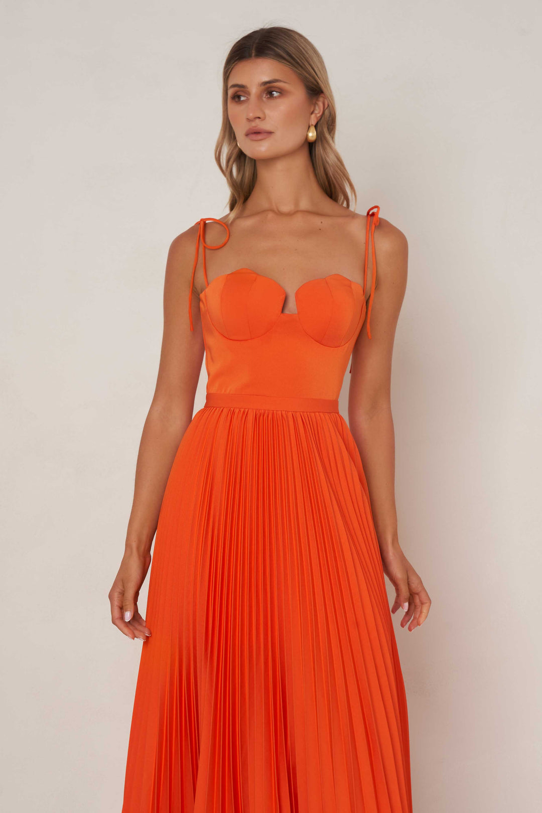 The Whitney dress is a gorgeous floaty midi, featuring a scalloped bustier detail and tie up straps. The Aline pleated skirt full and floaty creating an elegant and fun silhouette. also available in Sand and Tangerine.