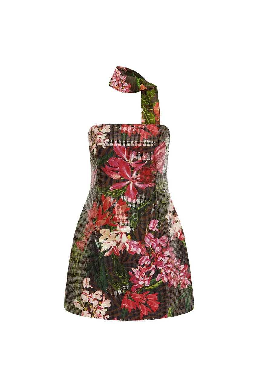 A rich pink floral print, neck scarf and glistening clear sequin overlay, our Ibiza Mini Dress will see you through late night dinner reservations.