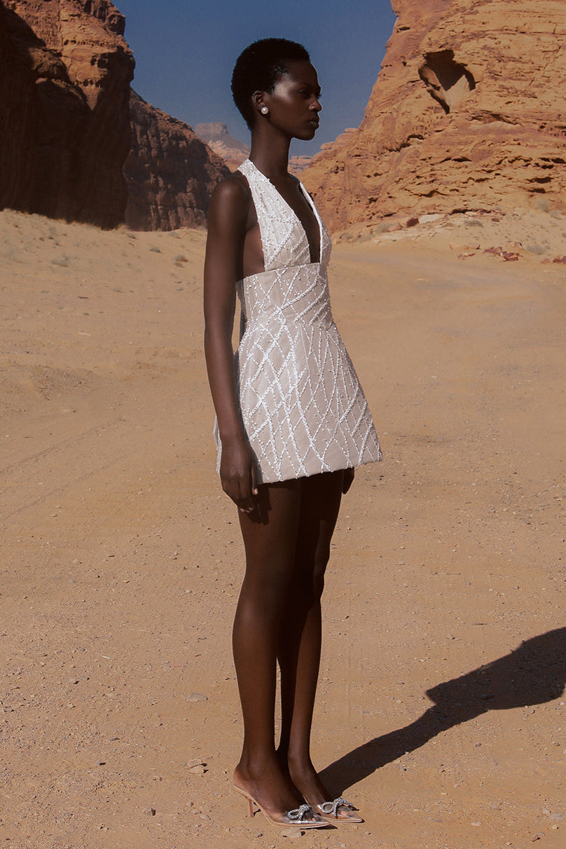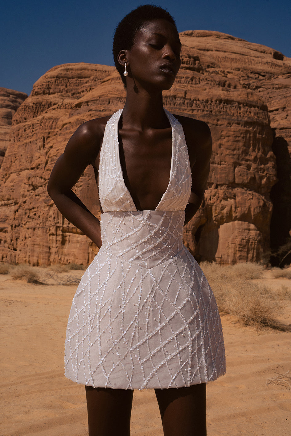 The Laurel Dress is the ultimate bridal mini, designed for the modern bride who seeks a statement look with timeless sophistication. This chic mini dress is crafted from luxurious embellished beaded fabrication, offering a captivating sparkle that catches the light with every movement.