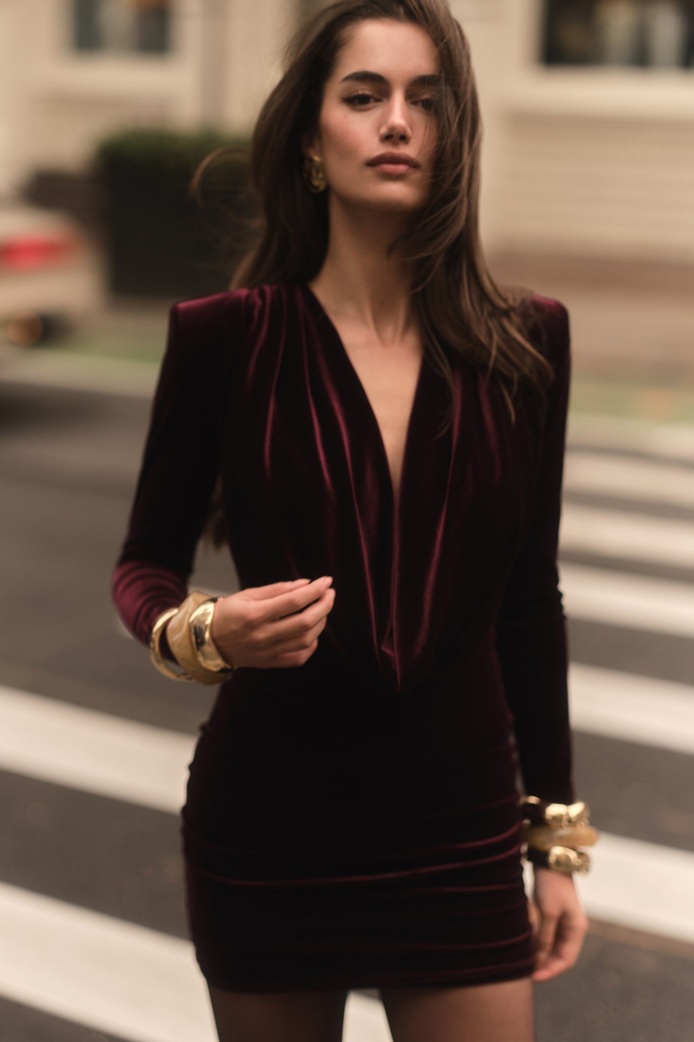 The Nookie Nina Long Sleeve Mini Dress is an incredible long sleeve mini with a deep, draped neckline, triangle bra and removable gold chain across the neck. It is crafted in our signature soft stretch velvet and is fully lined.