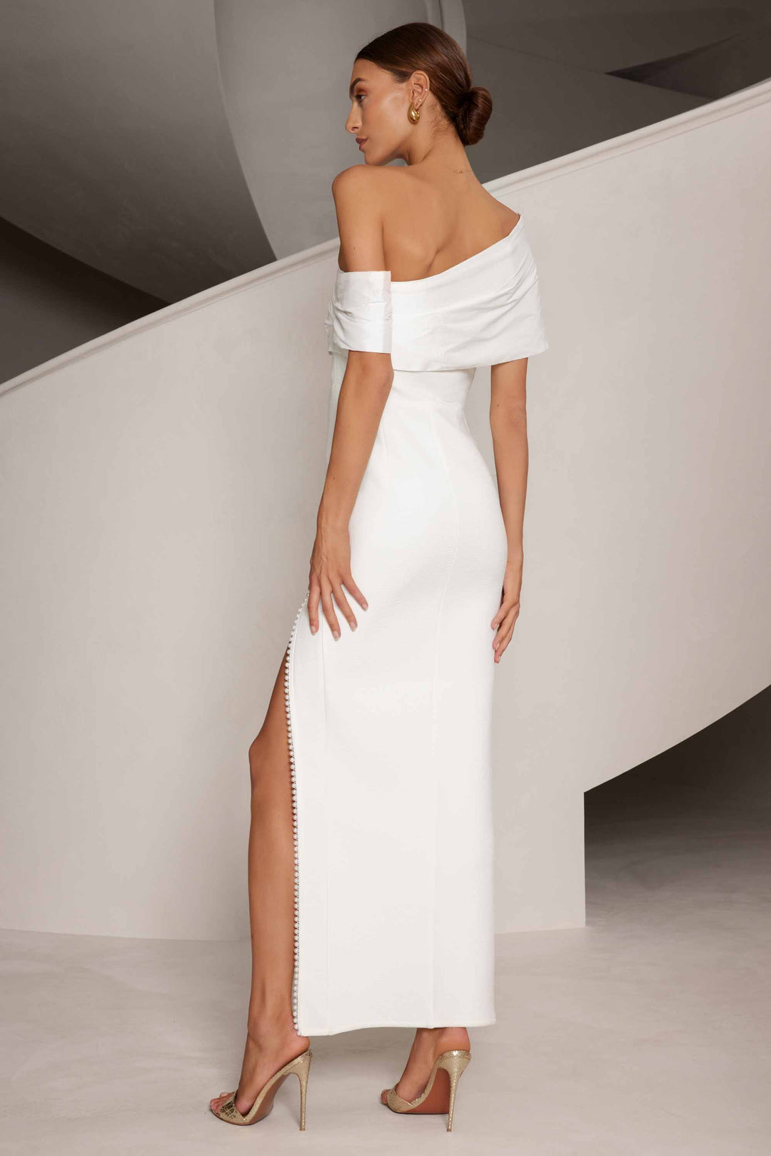 Our Gigi Maxi features a statement off the shoulder asymmetric detail accompanied by a sexy side split adorned with stunning pearls. Also available in White.
