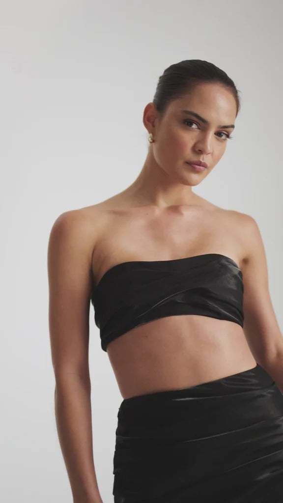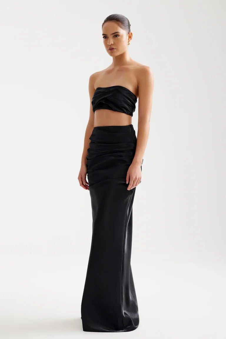 The Ariana Set is a striking two-piece ensemble crafted from liquid-look fabric that shimmers with every move. The bandeau-style top features elegant tucking, creating a structured yet fluid silhouette. The skirt mirrors this design with soft ruching and a sleek, floor-length finish. A bold yet refined choice for effortless sophistication.