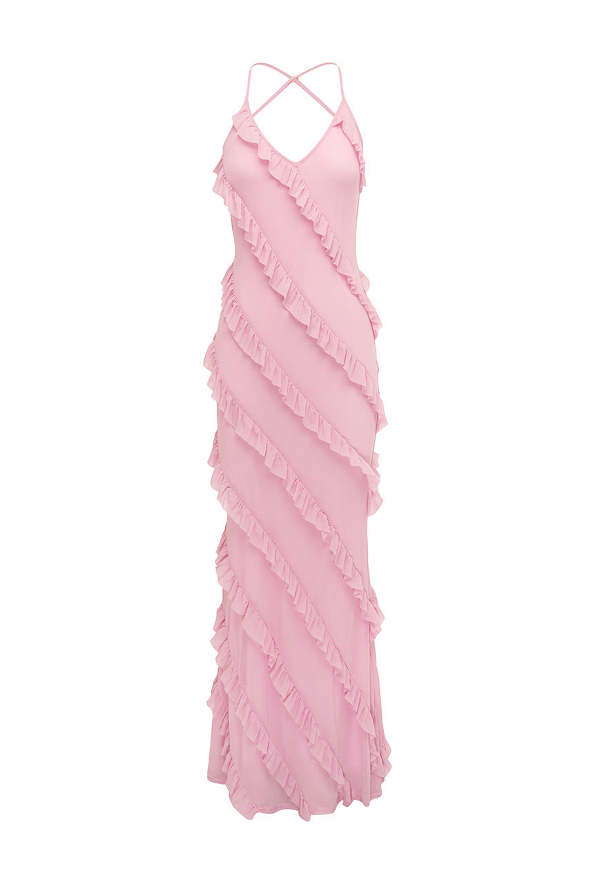 In a soft pink hue with delicate frills, our Barlow Maxi Dress will give you a whimsical feminine feel.