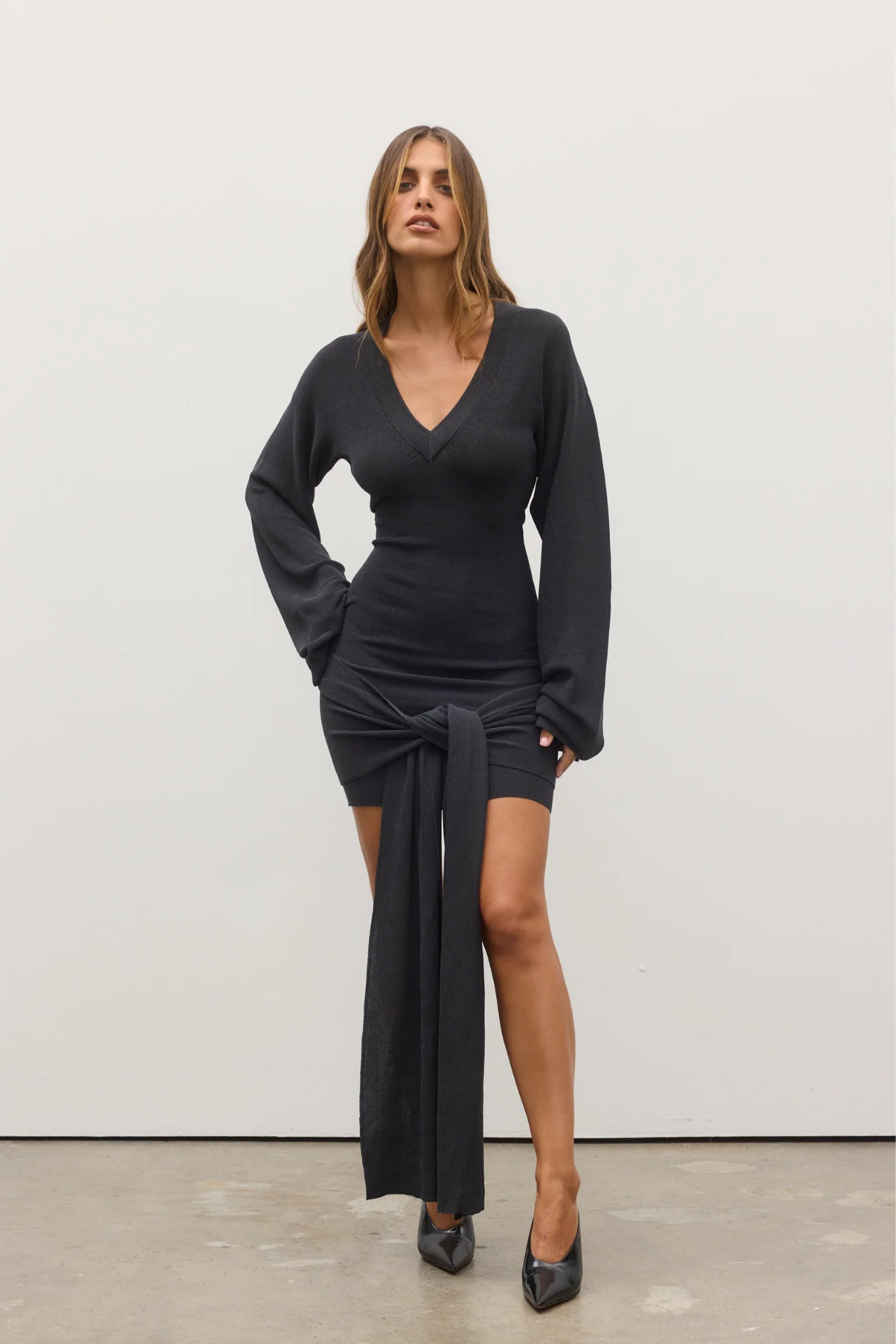 Introducing our Chantelle Knit Mini Dress is your ultimate day-to-night staple. Crafted from a soft, figure-hugging ribbed knit, this mini dress features a plunging V-neckline, long relaxed sleeves, and a statement front tie detail that cinches the waist and adds effortless edge.