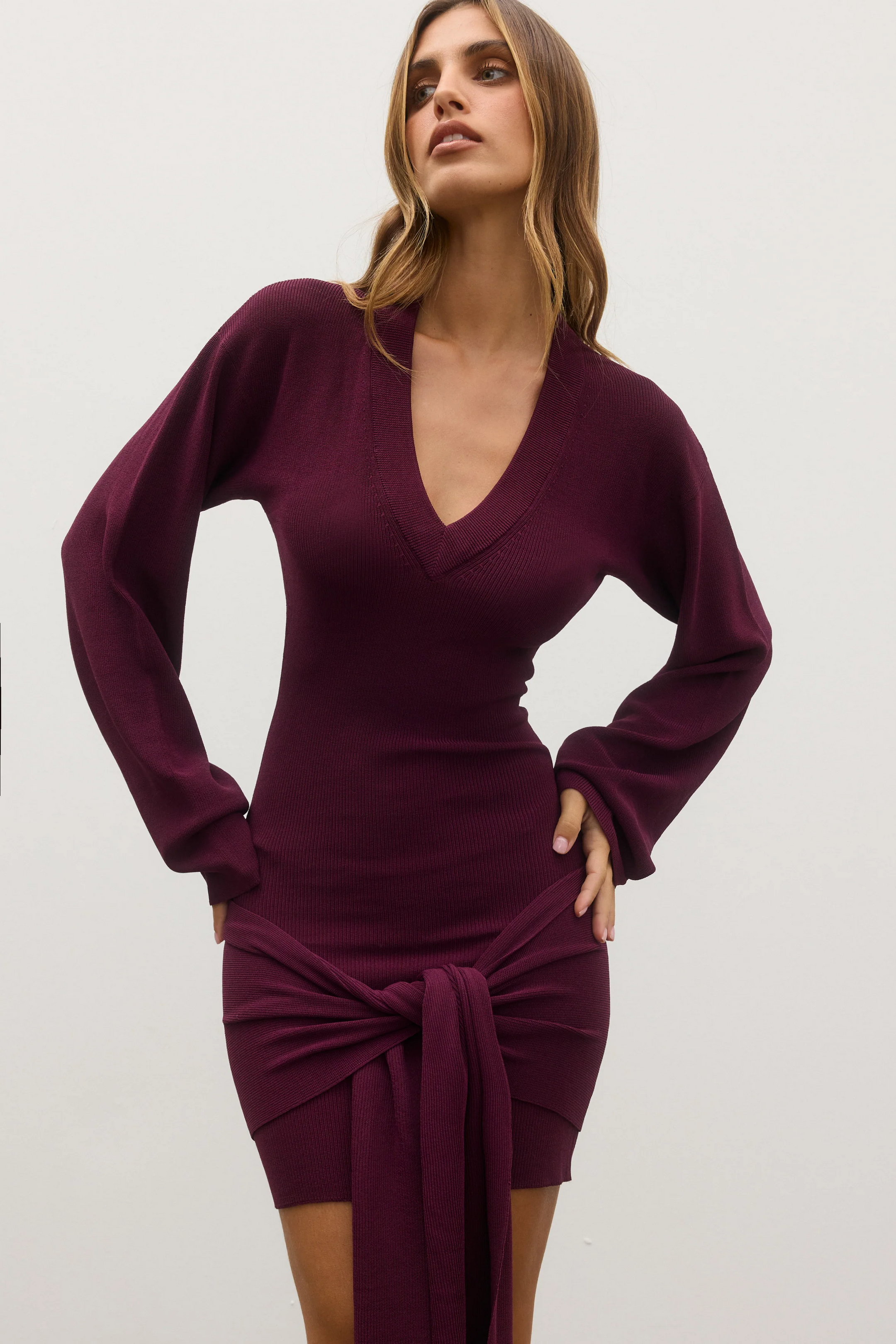 Introducing our Chantelle Knit Mini Dress is your ultimate day-to-night staple. Crafted from a soft, figure-hugging ribbed knit, this mini dress features a plunging V-neckline, long relaxed sleeves, and a statement front tie detail that cinches the waist and adds effortless edge.