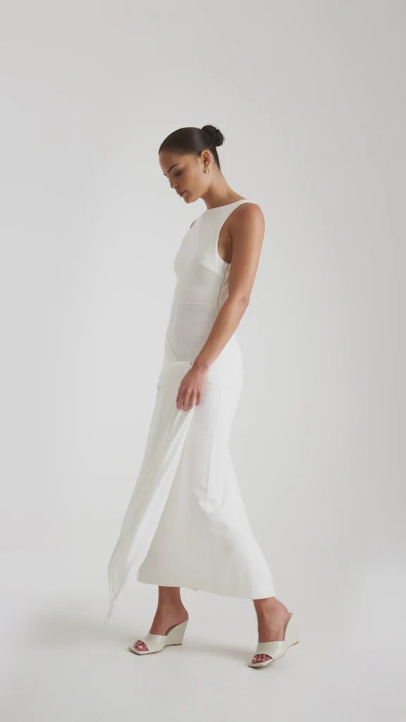 The Elara Dress embodies understated elegance with its high boat neckline and sleek straight skirt silhouette. A contrasting wrap mesh panel ties at the front, adding a delicate touch of texture. The open back and subtle back split complete the design with a hint of allure.