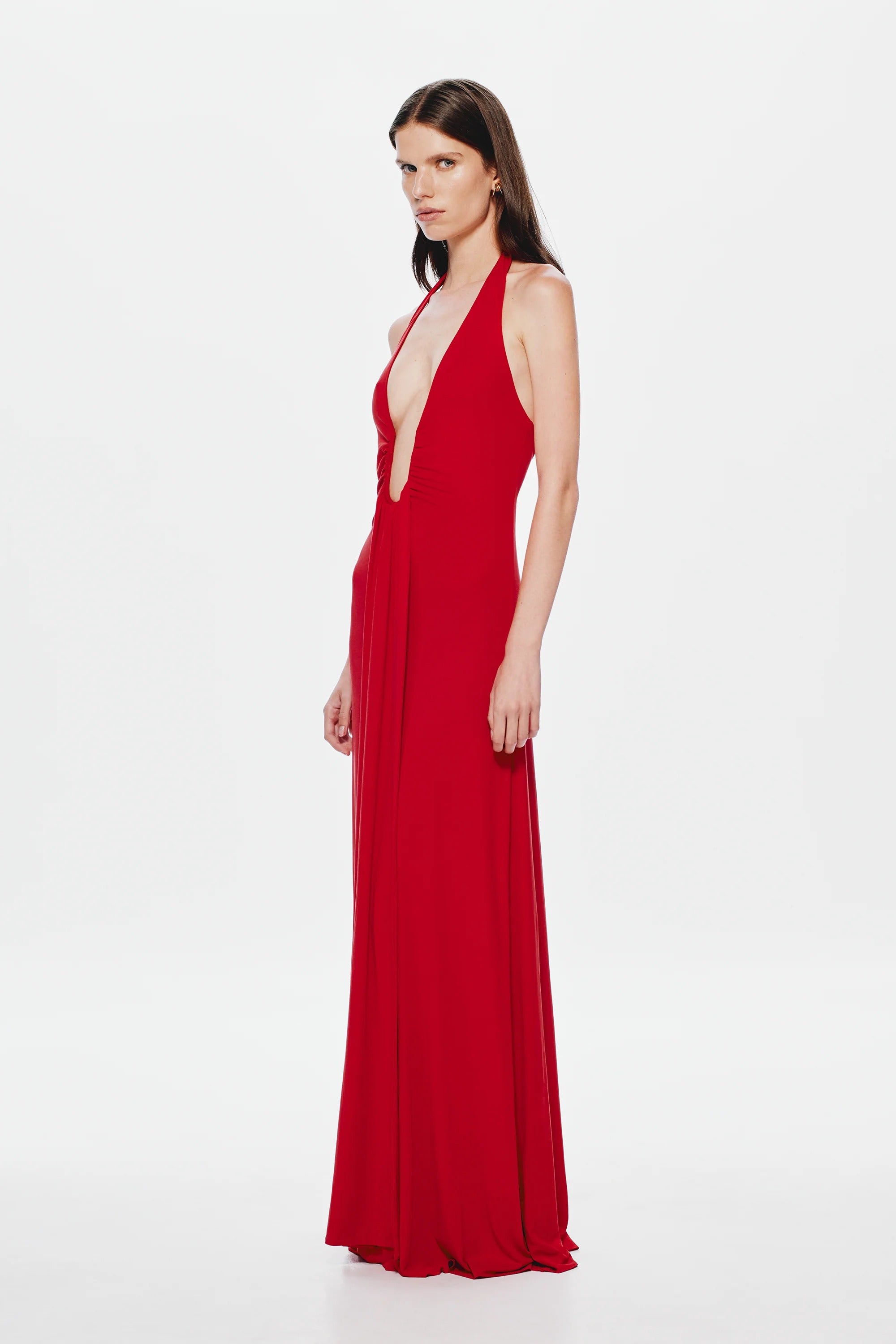 The Misha Jennifer Cupro Maxi Dress in Cherry is a captivating and sexy silhouette. It features a plunging halter neckline that is finished with an adjustable wire and waterfall sash detailing. Jennifer pushes the boundaries with her long clean lines that expose the wearers cleavage ever so subtly.