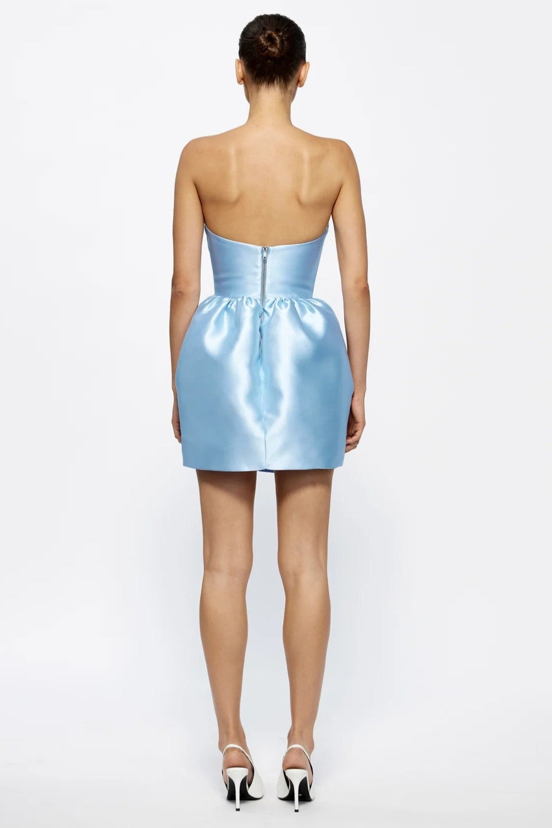 The Luetta Mini is a perfect blend of sweet and elegant. Designed with a curved strapless neckline that gracefully blends into a flirtatious bubble mini skirt with detailed ruching. Made with structured shaping through the bodice for a sleek silhouette. Crafted in our luxurious heavyweight satin for beautiful feel on the body.