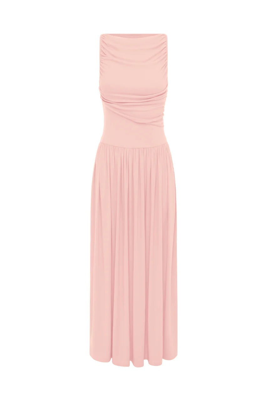 Our Nalla Maxi Dress showcases effortless elegance, with a boat neck and ruching throughout, it’s a versatile and timeless piece.