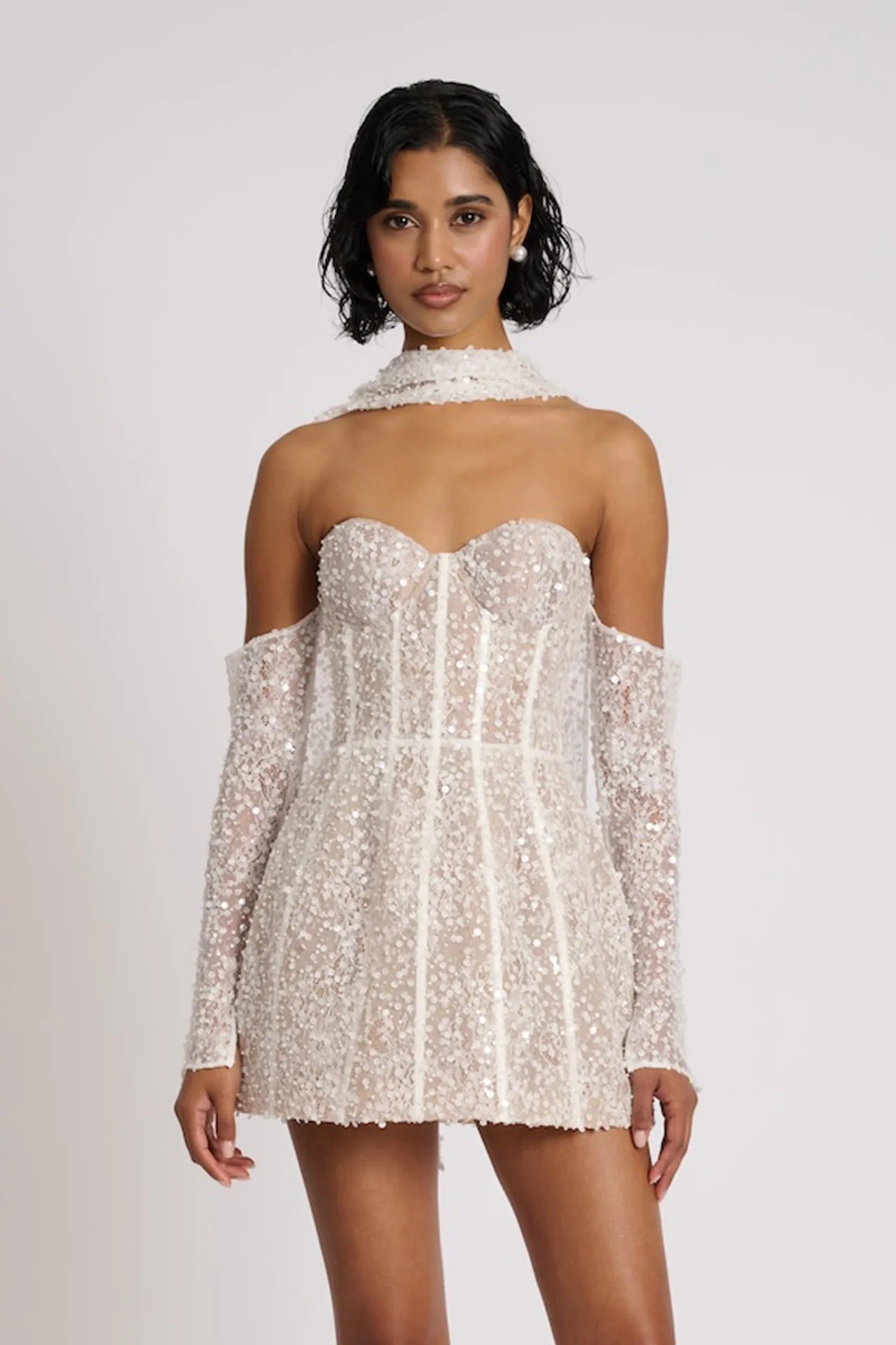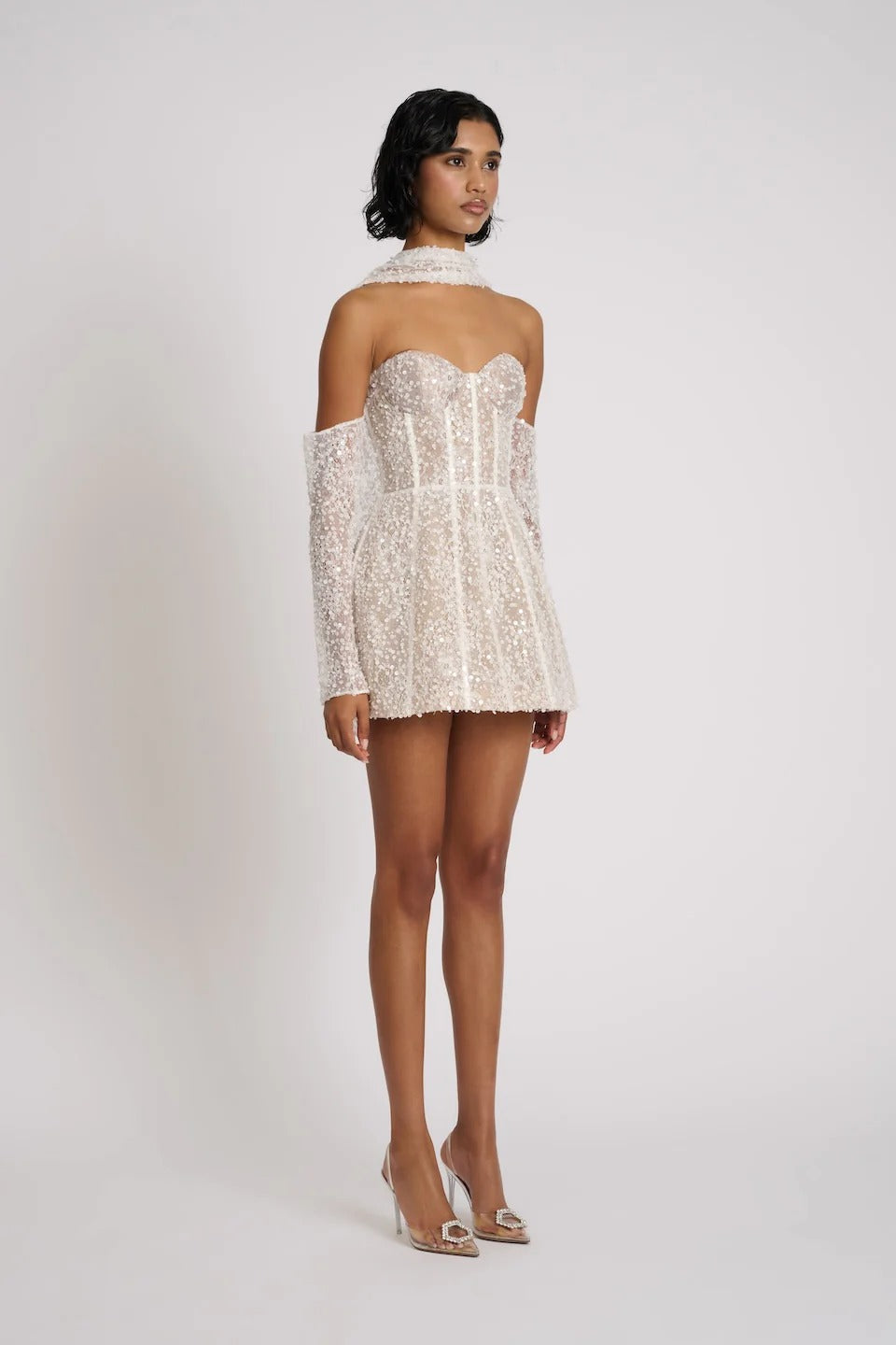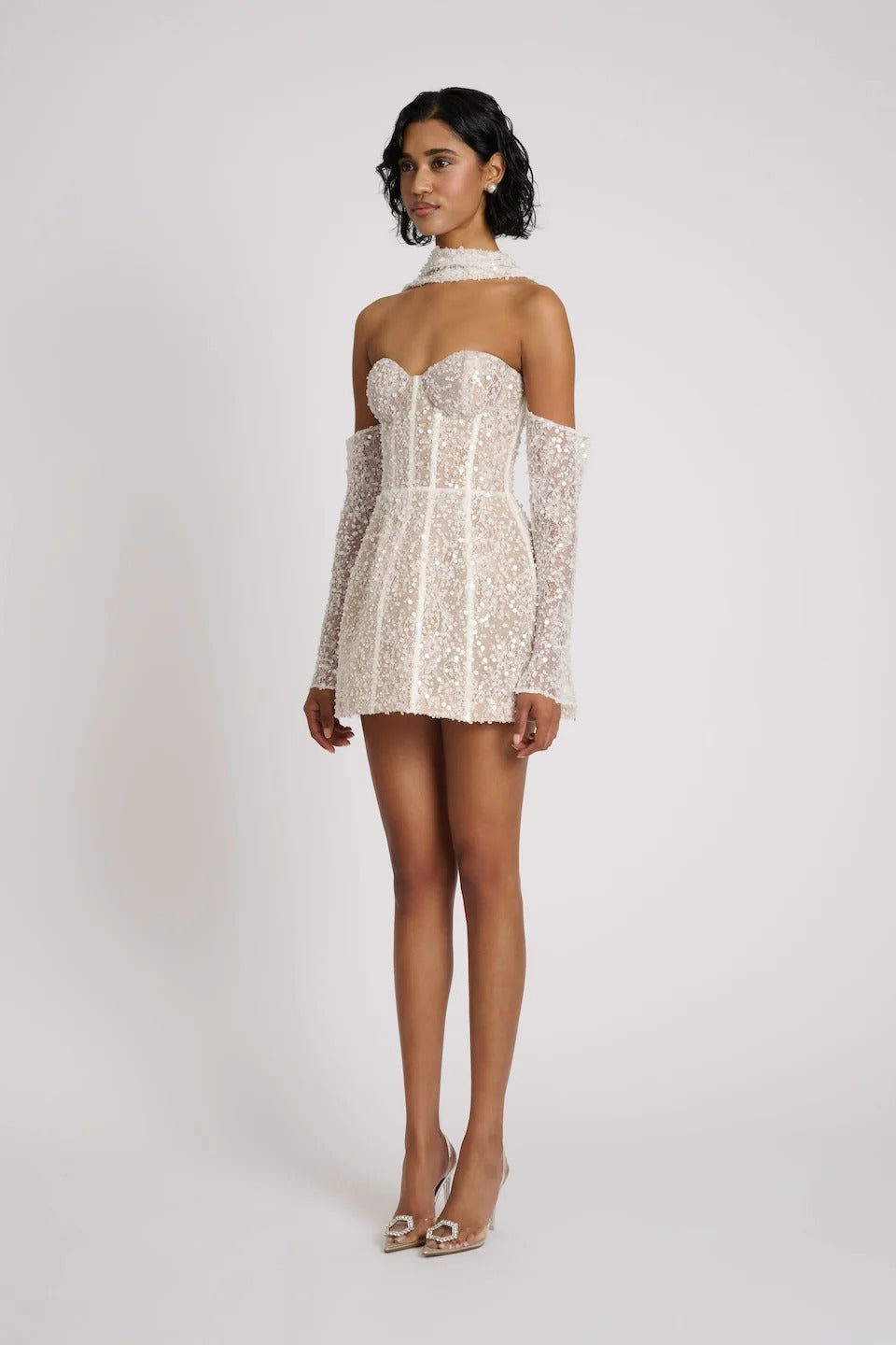 Step into timeless elegance with the Taline Dress, a breathtaking bridal mini dress designed to captivate from every angle. Crafted in luxurious embellished sequin lace, this dress shimmers with every step, offering a perfect blend of classic romance and modern sophistication.